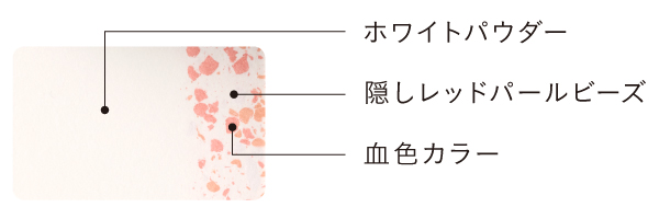 毛穴レスに仕上げるベースのホワイトパウダーの右サイドには、ツヤと温度感を補うレッドパールを忍ばせ、