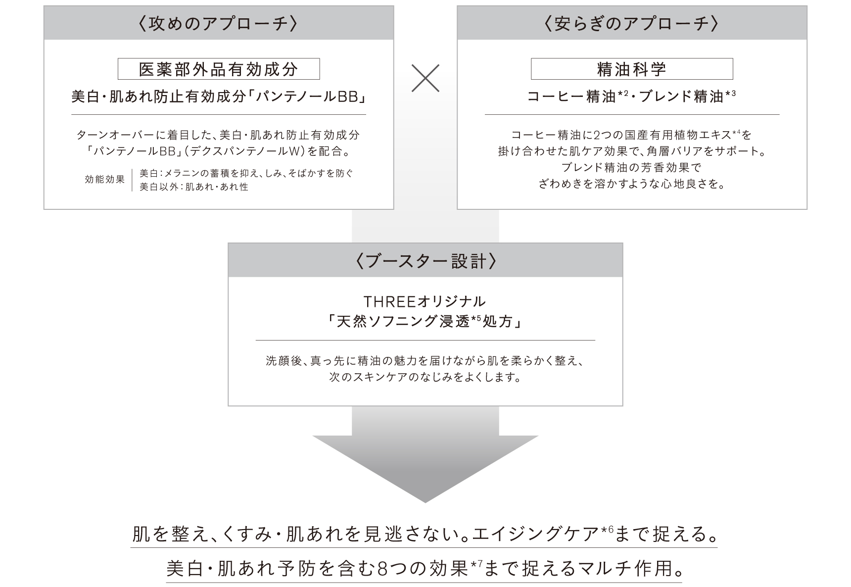 (ユキノシタエキス、オウバクエキス)を掛け合わせ、THREEオリジナル複合保湿成分を開発。