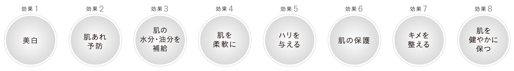 1.美白(メラニンの蓄積を抑え、しみ、そばかすを防ぐ) 2.肌あれを防ぐ 3.肌の水分・油分を補い保つ 4.肌を柔らげる 5.肌にハリを与える 6.肌を保護する 7.肌のキメを整える