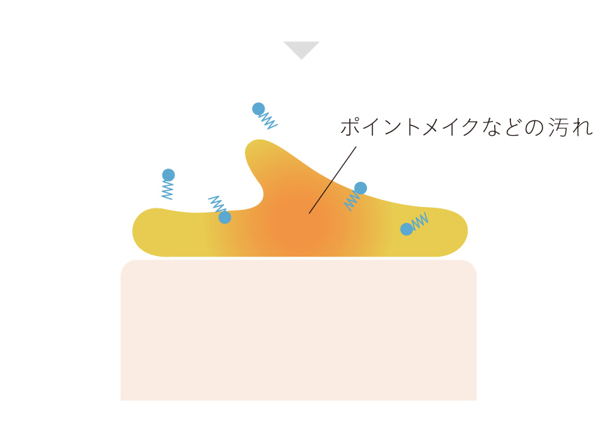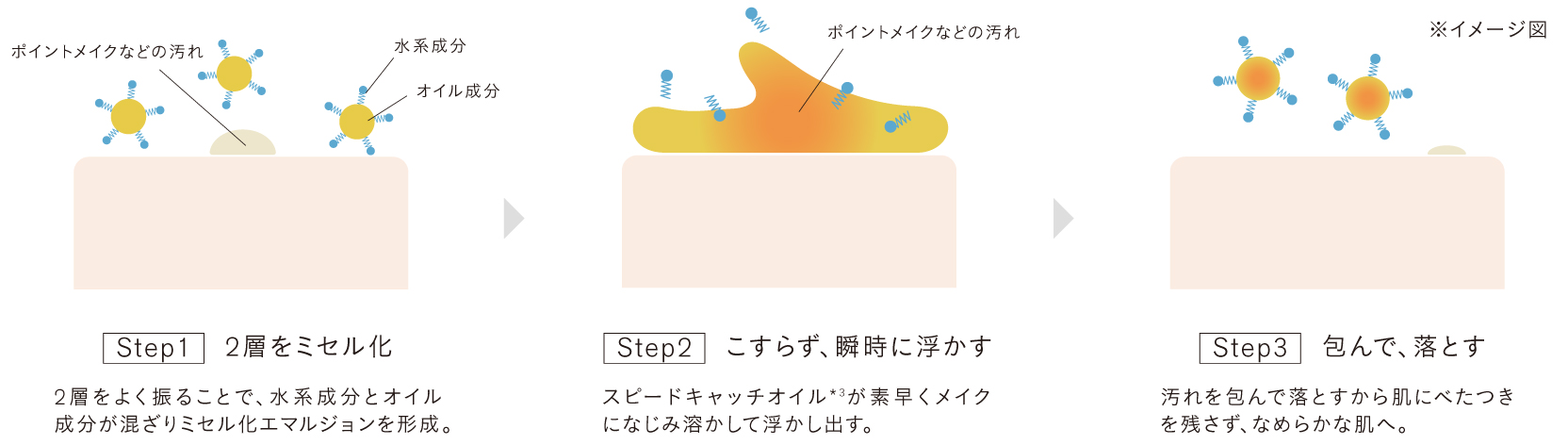 汚れ落ちに優れたスピードキャッチオイル*3配合の油相×芳香蒸留水*2配合の水相を、シェイクすることでミセル化する
