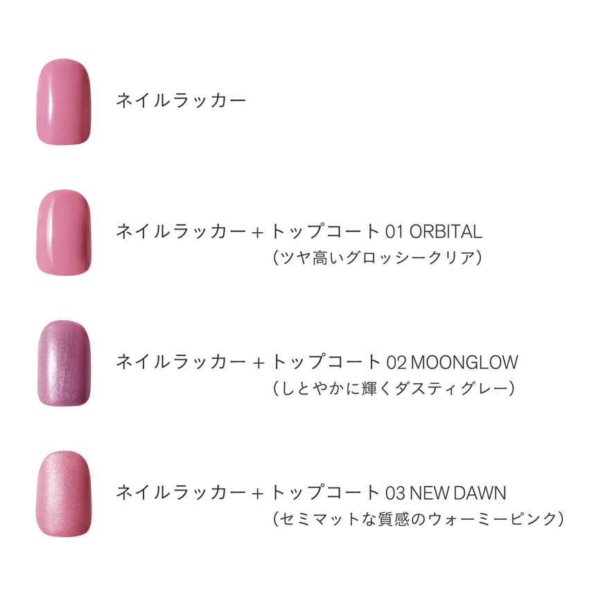 また、ベースコートなしでも爪表面の凹凸を埋めるように均一に膜を形成し、1本でクリアな発色と美しいツヤのある仕上がりが叶います。